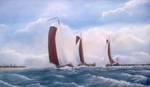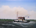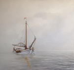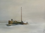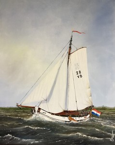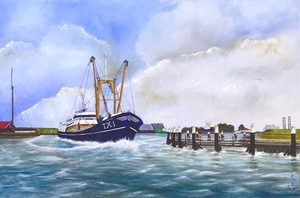 2022De viskotter Texel 1 - Klasina-J vaart weg uit de haven van Oudeschild Texel. Olieverf op doek 120 x 80